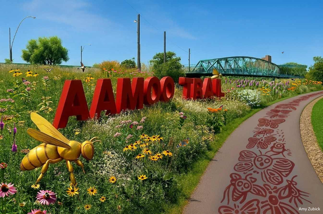 As you stroll the paved path through the urban prairie, you encounter educational signage. This signage can feature scavenger hunt elements providing a character or information that can be digitally collected, or a laser cut detail that can be collected as a crayon rubbing, or a stamp that cuts out a unique shape.